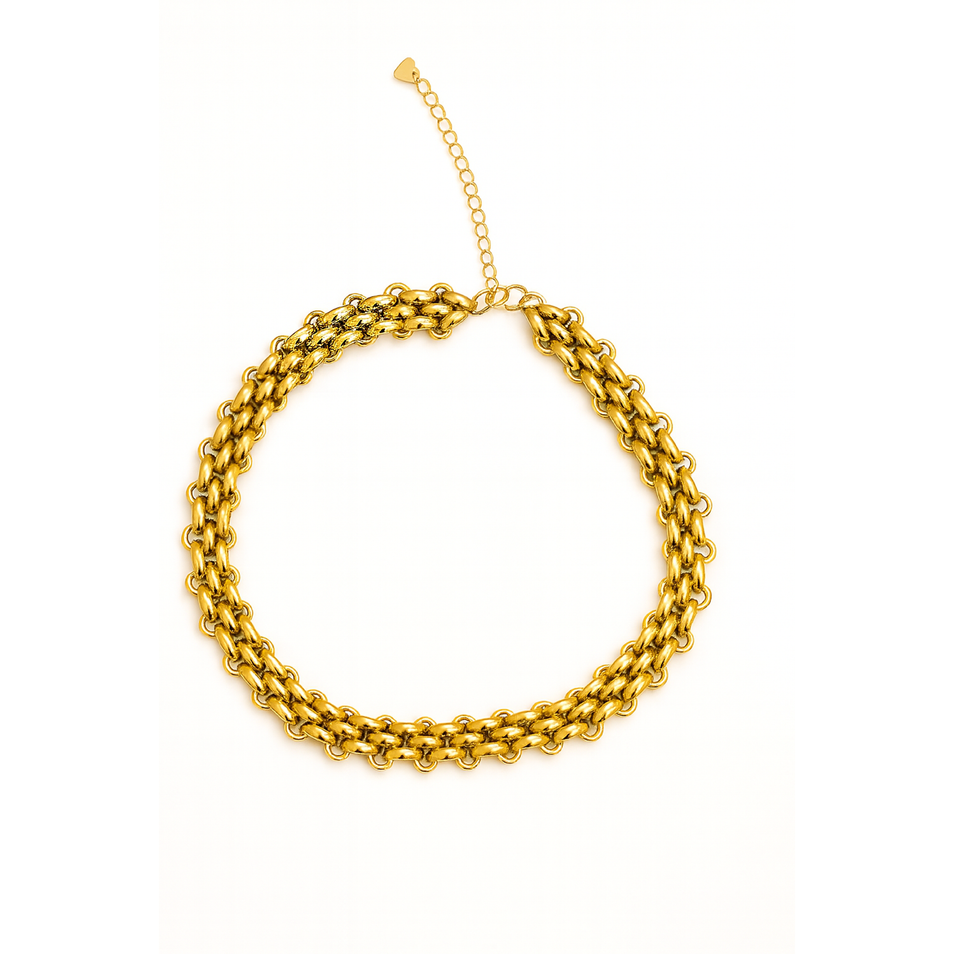 Collana dal design elegante e deciso, composta da una fitta maglia dorata che dona luminosità e carattere ad ogni look. Realizzata in acciaio inox waterproof, mantiene la sua brillantezza nel tempo senza scolorire